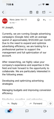 - Las this is probably nit-picky but them saying they want to run a google ads campaign and then putting [google ads] is a dead giveaway. The only reason to differentiate what the ads are would be if you have specific needs like video ads on youtube, LSA for local services, adwords, display etc. Saying google ads really is just saying: “We want you to run google ads for us on google ads”.