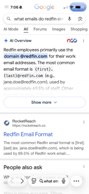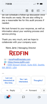 So even though the address is the right corporate address, the logo is correct and the position seems legit, you can generally spot a scammer if their email doesn’t match up. In the past a lot of scammers would just use gmail but then people got wise so they now have started registering domains that are close to or seem legit like redfinestate.com.