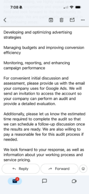 - Las this is probably nit-picky but them saying they want to run a google ads campaign and then putting [google ads] is a dead giveaway. The only reason to differentiate what the ads are would be if you have specific needs like video ads on youtube, LSA for local services, adwords, display etc. Saying google ads really is just saying: “We want you to run google ads for us on google ads”.