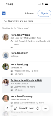 OK last check I wanted to do was to see if Nora Jane had a profile on LinkedIn. Someone in her position would for sure have a profile even if it wasn’t constantly updated. So doing a quick LinkedIn search I found the following: